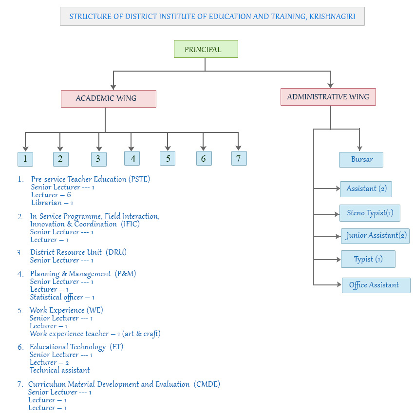 In Tamil Nadu, there are totally 32 DIETs at present established in 4 phases among which DIET Krishnagiri is established in second phase in the year 1996. Situated in the outskirts of Krishnagiri town, on Chennai highways near significant landmark of Government arts college and Polytechnic, our DIET is functioning with seven departments . Their functions are listed as found here.